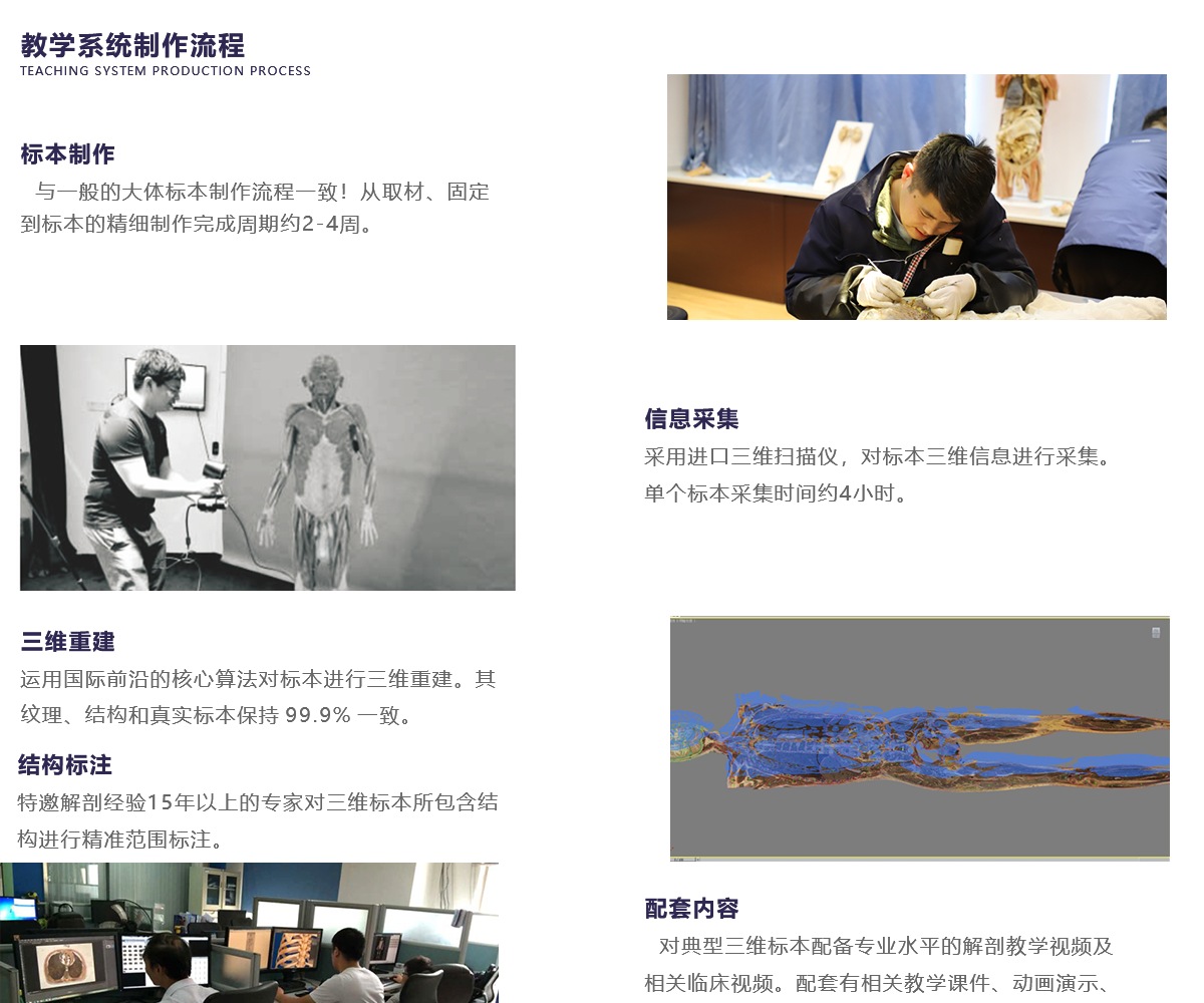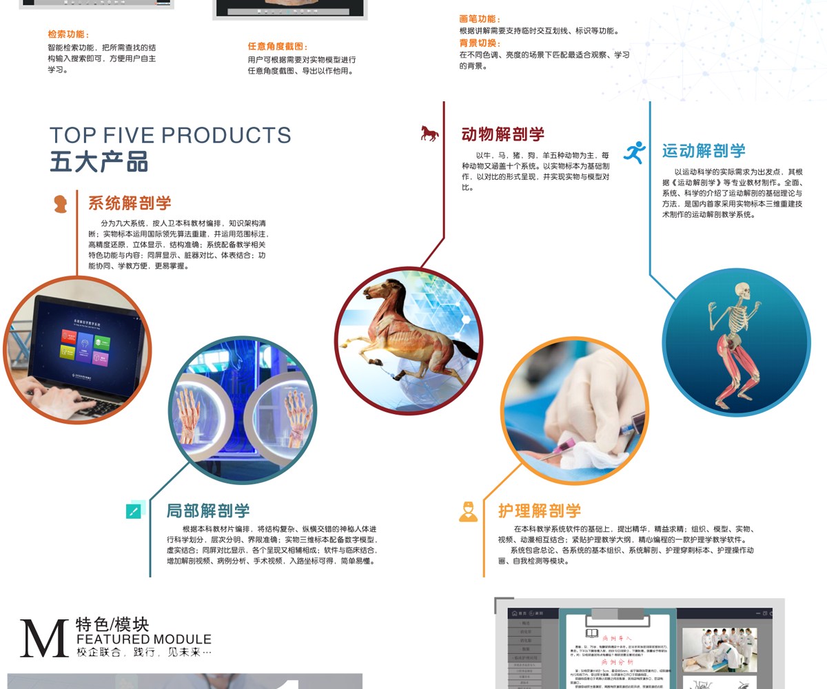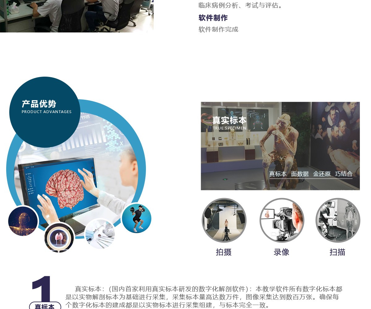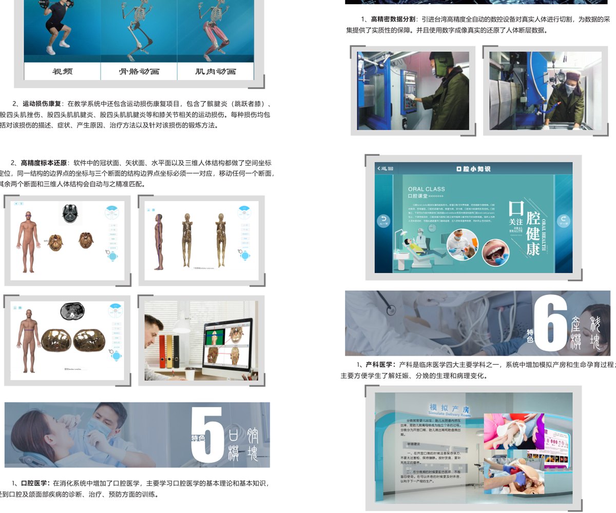 我公司联合国内数家知名医学院校,几十位专家教授共同努力,历经十年研发而成;随后推出一系列基础教学软件并皆得到了业界专家和各大医学院校的一致好评。其软件与教学大纲紧密结合,是国内首家以真实标本为依托采用三维重建技术制作的解剖教学系统。 该教学系统包含了系统、局解、运动、护理、动物等系统模块,采用结合了计算机辅助几何设计( CAGD )、计算机图形学( CG )、计算机动画、计算机视觉、医学图像处理、科学计算 和虚拟现实、数字媒体创作等领域的三维重建技术制作而成。所有教学系统都100%保留解剖标本的真实性,真正意义上实现了真实标本的数字化。