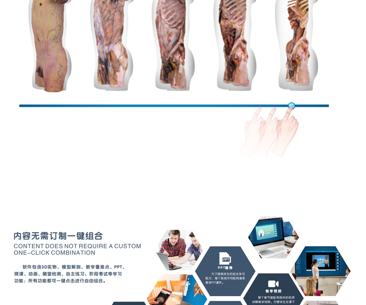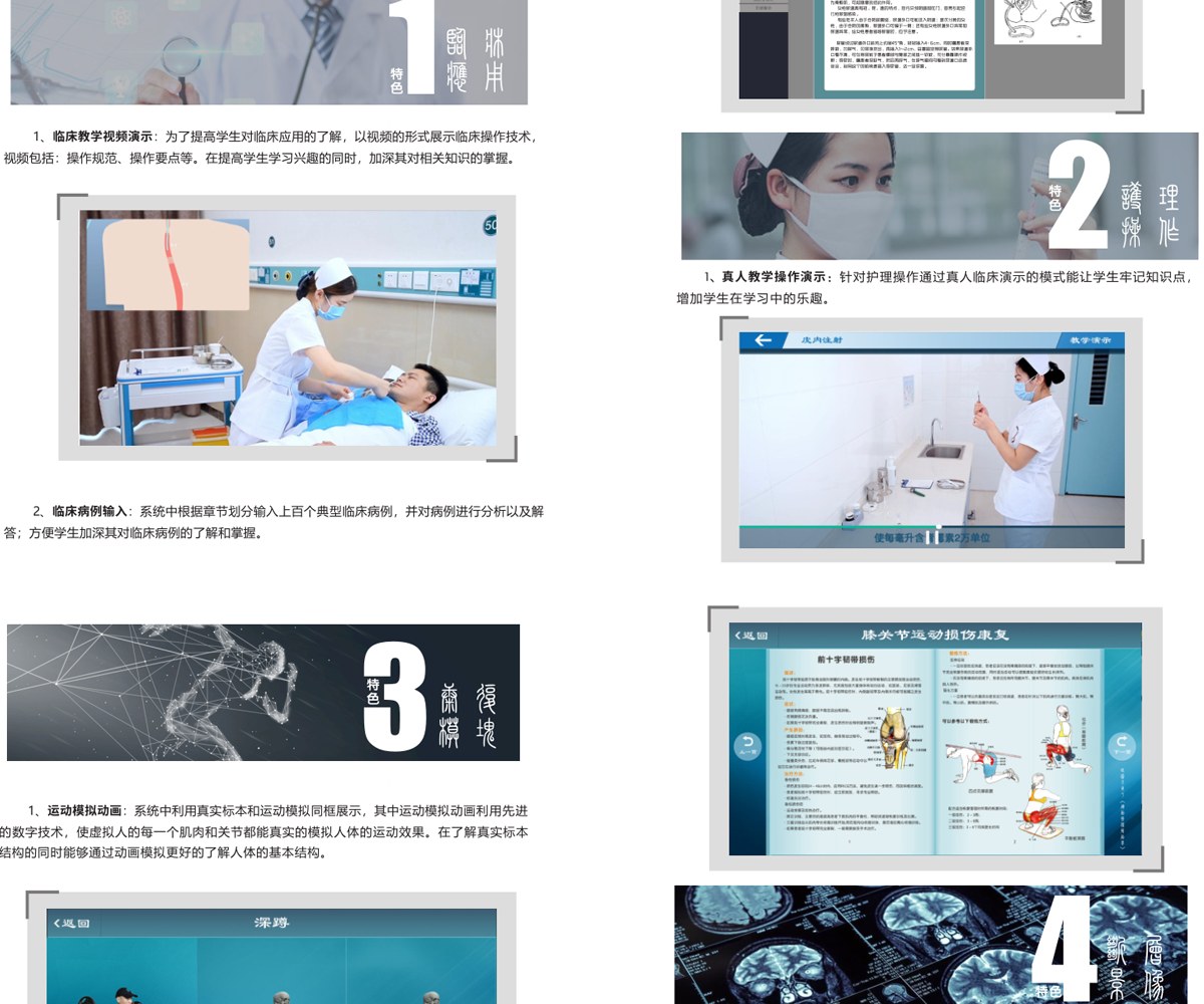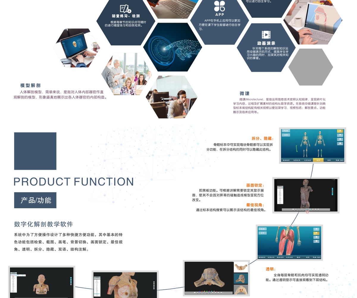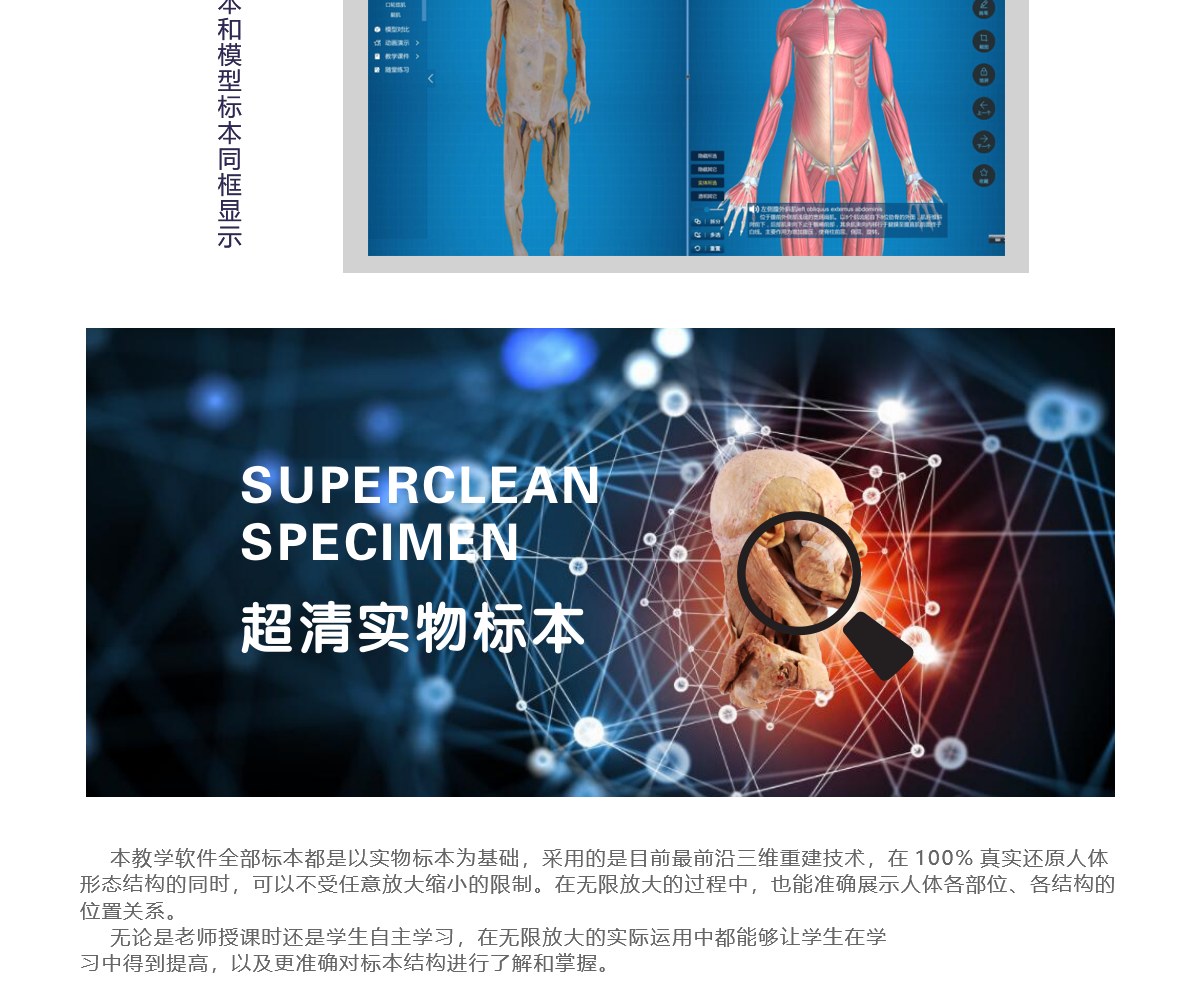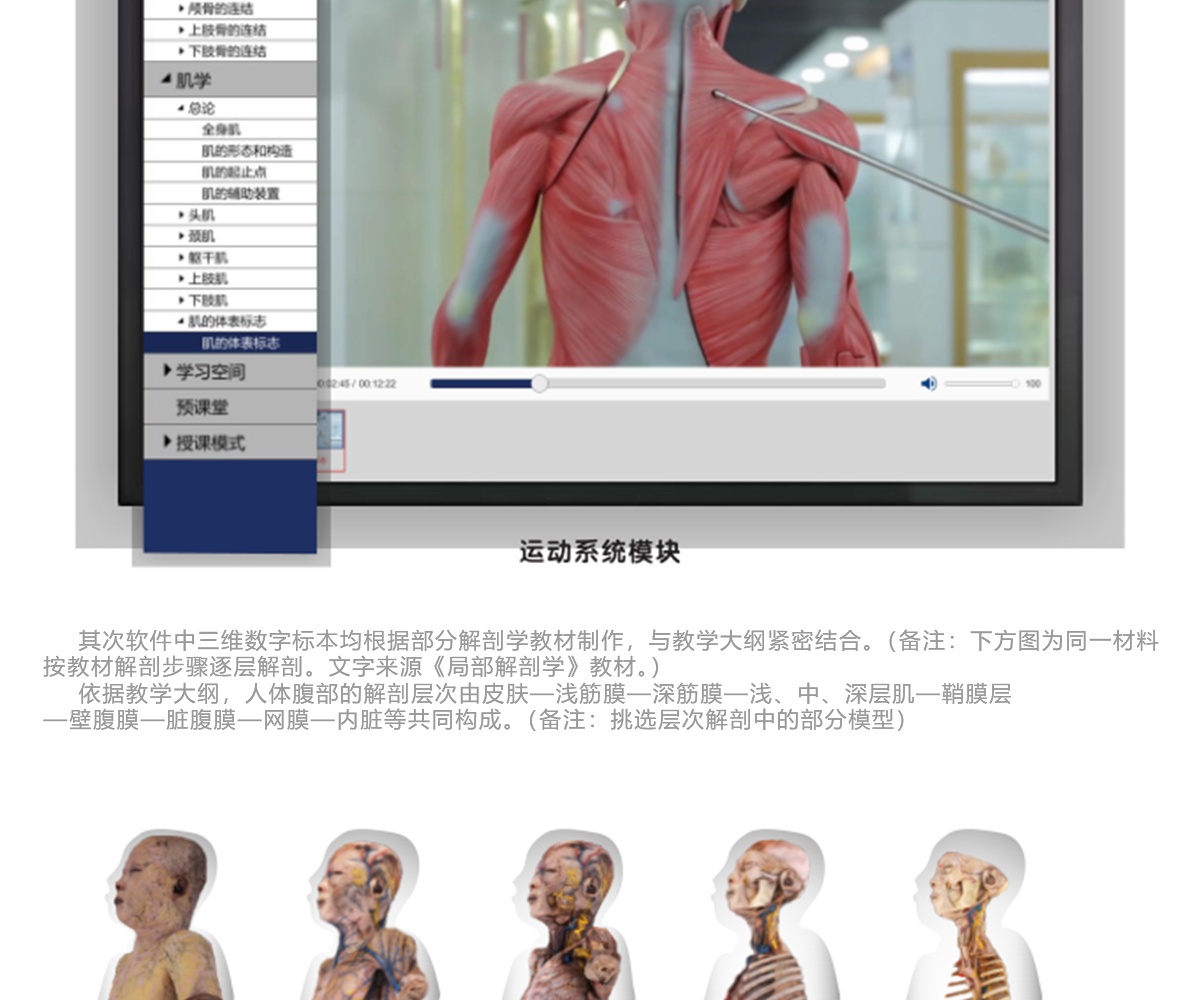 我公司联合国内数家知名医学院校,几十位专家教授共同努力,历经十年研发而成;随后推出一系列基础教学软件并皆得到了业界专家和各大医学院校的一致好评。其软件与教学大纲紧密结合,是国内首家以真实标本为依托采用三维重建技术制作的解剖教学系统。 该教学系统包含了系统、局解、运动、护理、动物等系统模块,采用结合了计算机辅助几何设计( CAGD )、计算机图形学( CG )、计算机动画、计算机视觉、医学图像处理、科学计算 和虚拟现实、数字媒体创作等领域的三维重建技术制作而成。所有教学系统都100%保留解剖标本的真实性,真正意义上实现了真实标本的数字化。