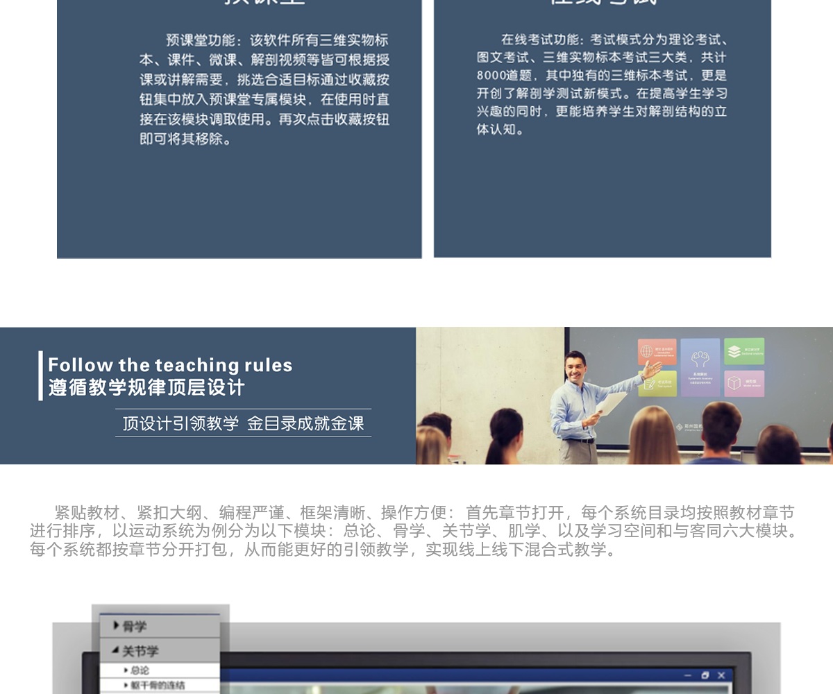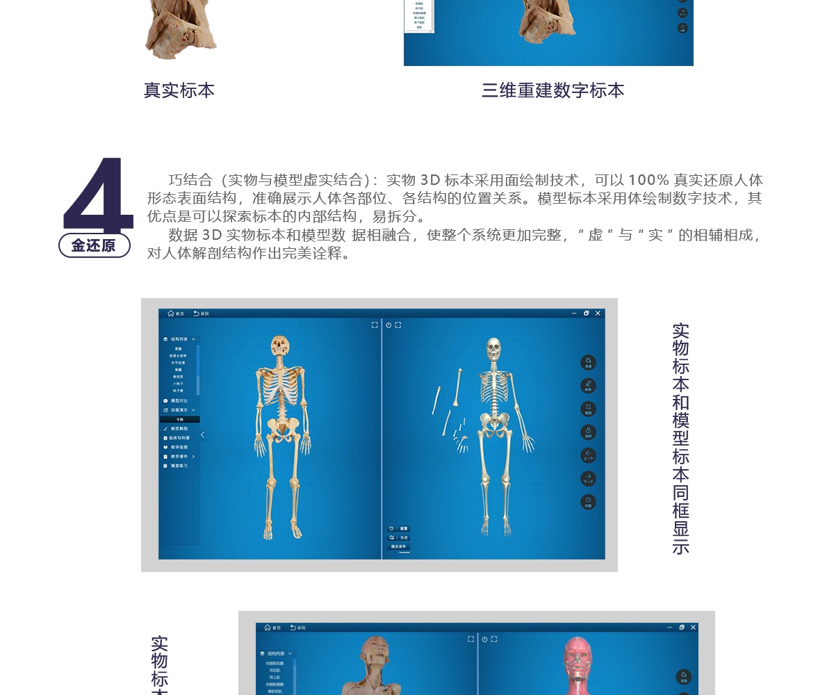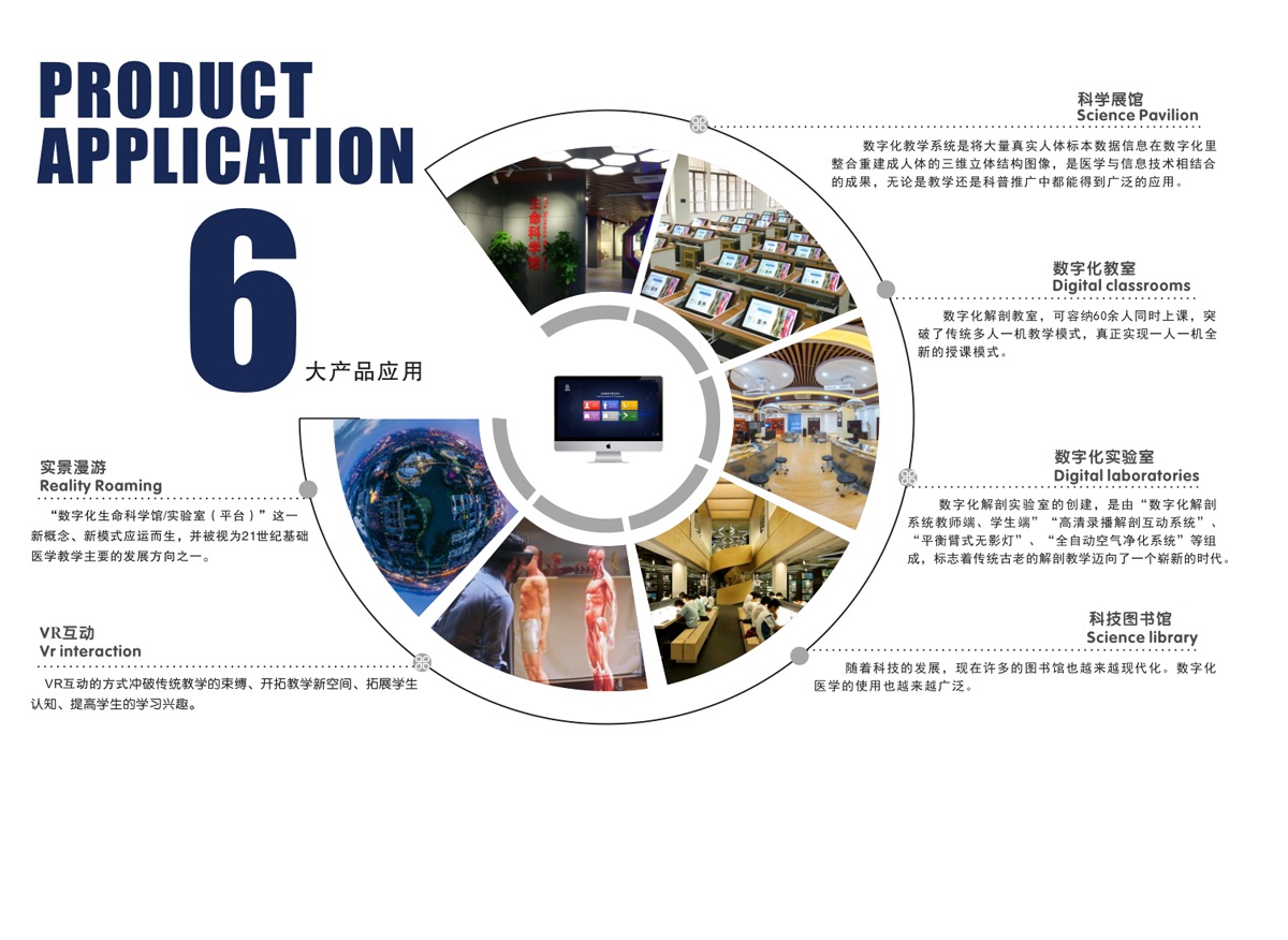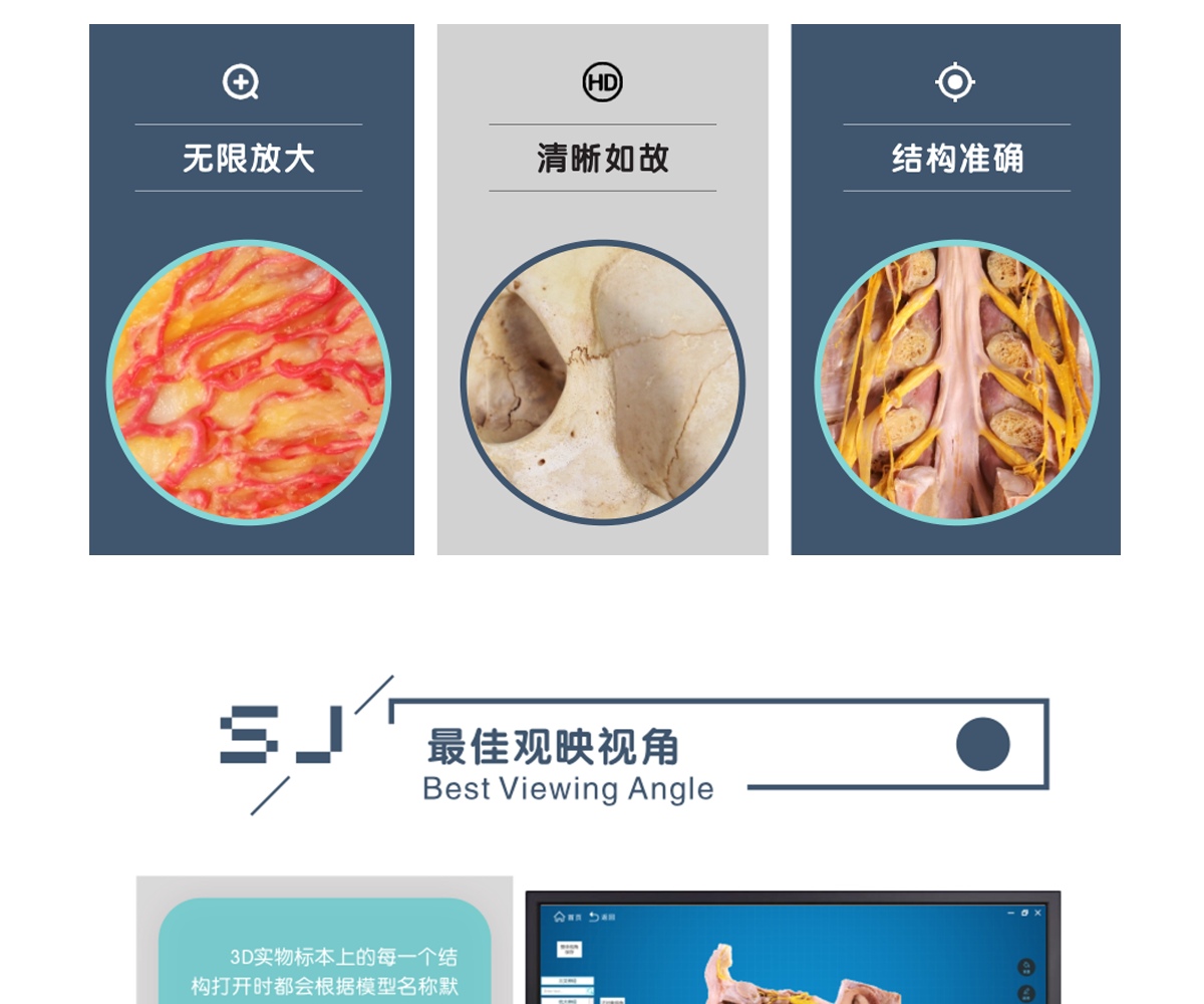 我公司联合国内数家知名医学院校,几十位专家教授共同努力,历经十年研发而成;随后推出一系列基础教学软件并皆得到了业界专家和各大医学院校的一致好评。其软件与教学大纲紧密结合,是国内首家以真实标本为依托采用三维重建技术制作的解剖教学系统。 该教学系统包含了系统、局解、运动、护理、动物等系统模块,采用结合了计算机辅助几何设计( CAGD )、计算机图形学( CG )、计算机动画、计算机视觉、医学图像处理、科学计算 和虚拟现实、数字媒体创作等领域的三维重建技术制作而成。所有教学系统都100%保留解剖标本的真实性,真正意义上实现了真实标本的数字化。