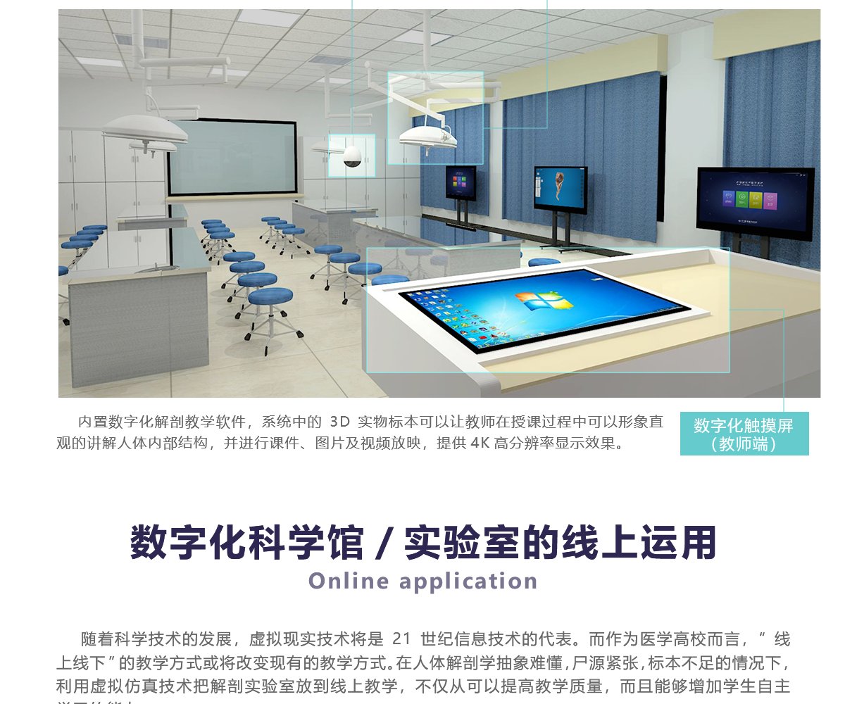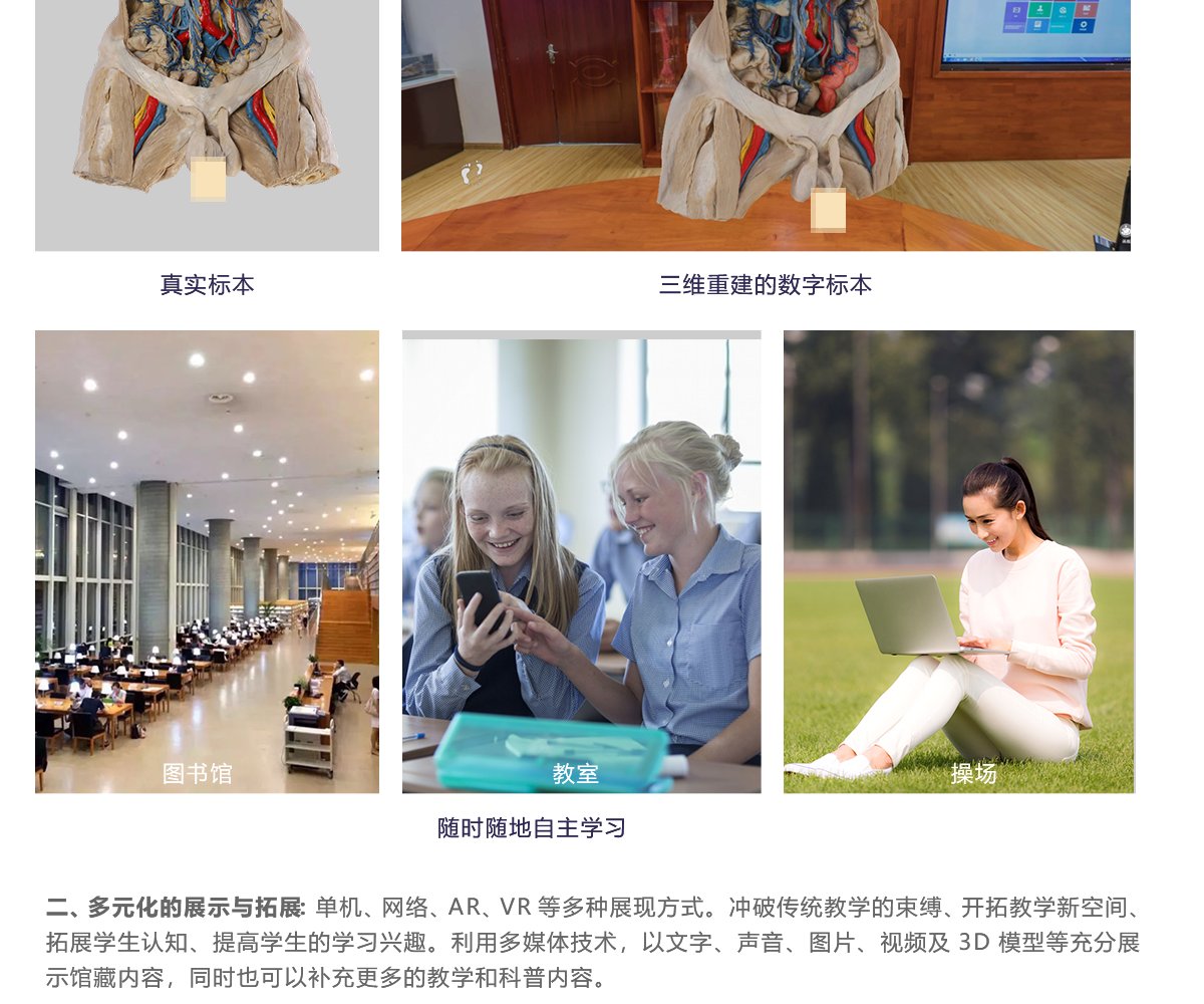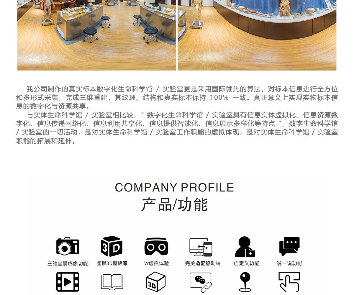 数字化生命科学馆 / 实验室(平台)是运用虚拟现实技术、 三维图形图像技术、计算机网络技术、立体显示系统、互动娱 乐技术、特种视效技术,将现实存在的生命科学馆 / 实验室以 一种多源信息融合的、交互式的三维动态视景和实体行为的系 统仿真方式使用户沉浸到该模拟环境中。参观者能在虚拟环境 中随意浏览,观看馆内各种产品、标本的三维展示并查看学习 其相关的信息资料。通过数据库检索可以查阅馆内各类产品、 标本的信息。